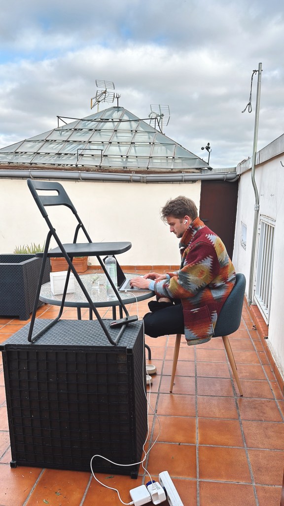 Christian’s day is flipped. He typically works from 12-8, but it all depends on when he starts. He spends his mornings walking me to the Metro station and working out. Oftentimes, he will meet up with Zach and play chess in Retiro Park or visit a new museum. He’s gotten very creative with his work spaces, working primarily on our terrace, weather permitting. As I’m writing this, standing on a bus in Gran Canaria, he’s standing next to me with his laptop open – actively participating in a meeting. Definitely living up to his digital nomad status.