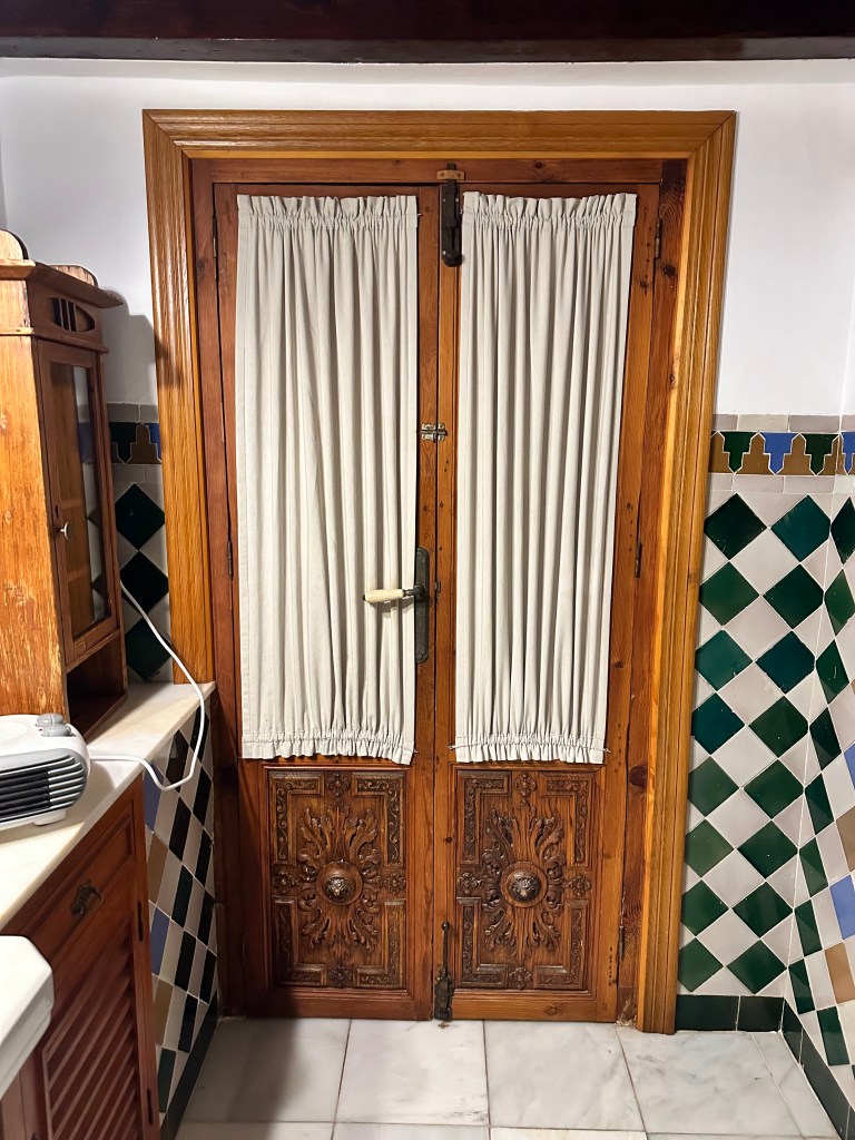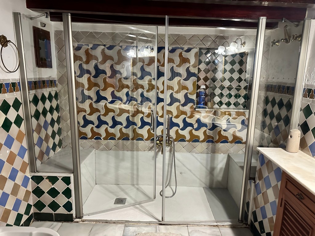 After breakfast, we walked back over to officially pack up and shower off. I called dibs on the first shower and immediately regretted it. I was very much looking forward to a refreshing shower, as it was substantially larger than our one in Madrid. As pictured below, the shower head wasn’t attached to the wall, so while in the shower I turned the water off when washing my hair and body, so it didn’t thrash around everywhere. However, little did I know that while I was strutting around to and fro, perhaps using the shower head as a microphone, water was seeping its way out of the shower, completely covering the bathroom floor. As I stepped out to grab my towel from the counter, I noticed the ocean I had created in the bathroom. Not only had water almost made its way across the entire bathroom, but it had completely soaked my clothes that I had haphazardly dumped on the floor before hopping into the shower. One of my two outfits, and in particular, my comfy pants for the overnight bus ride home were absolutely drenched. Feeling defeated, I quickly dried off, scooped up my soaking wet clothes, and used what drying ability my towel had left to mop up the floor. I warned Christian about the hazard and went to find a place to lay my pants to dry while we were out for the day. Lesson learned: don’t throw my clothes on the floor before stepping into unknown showers.
