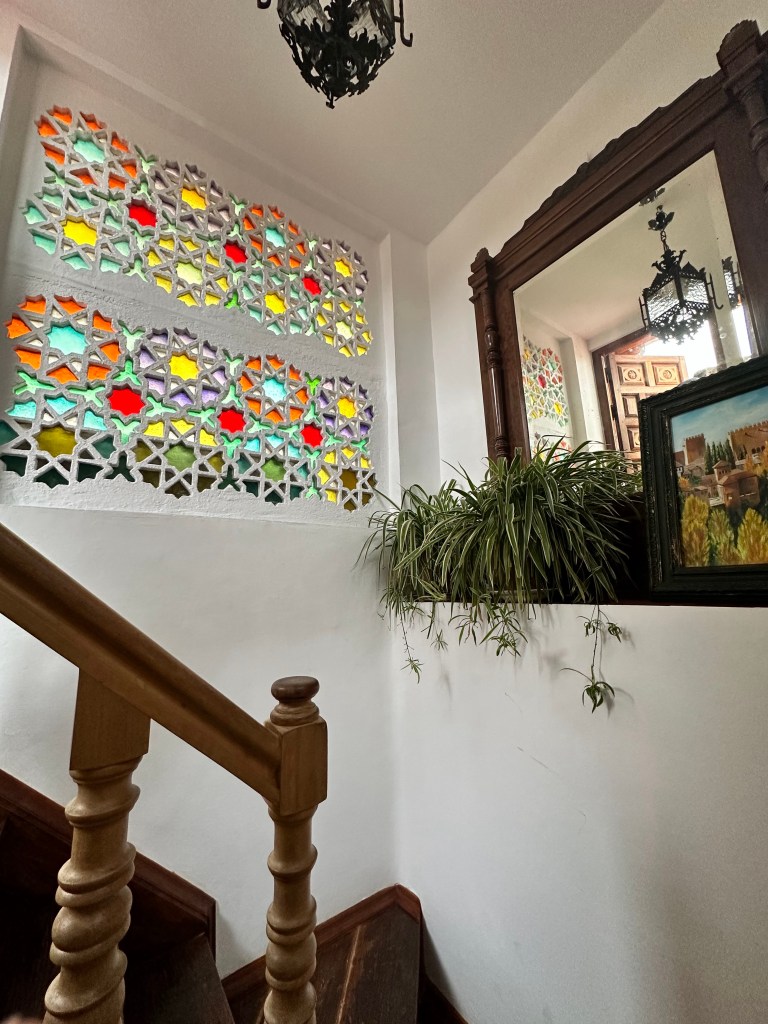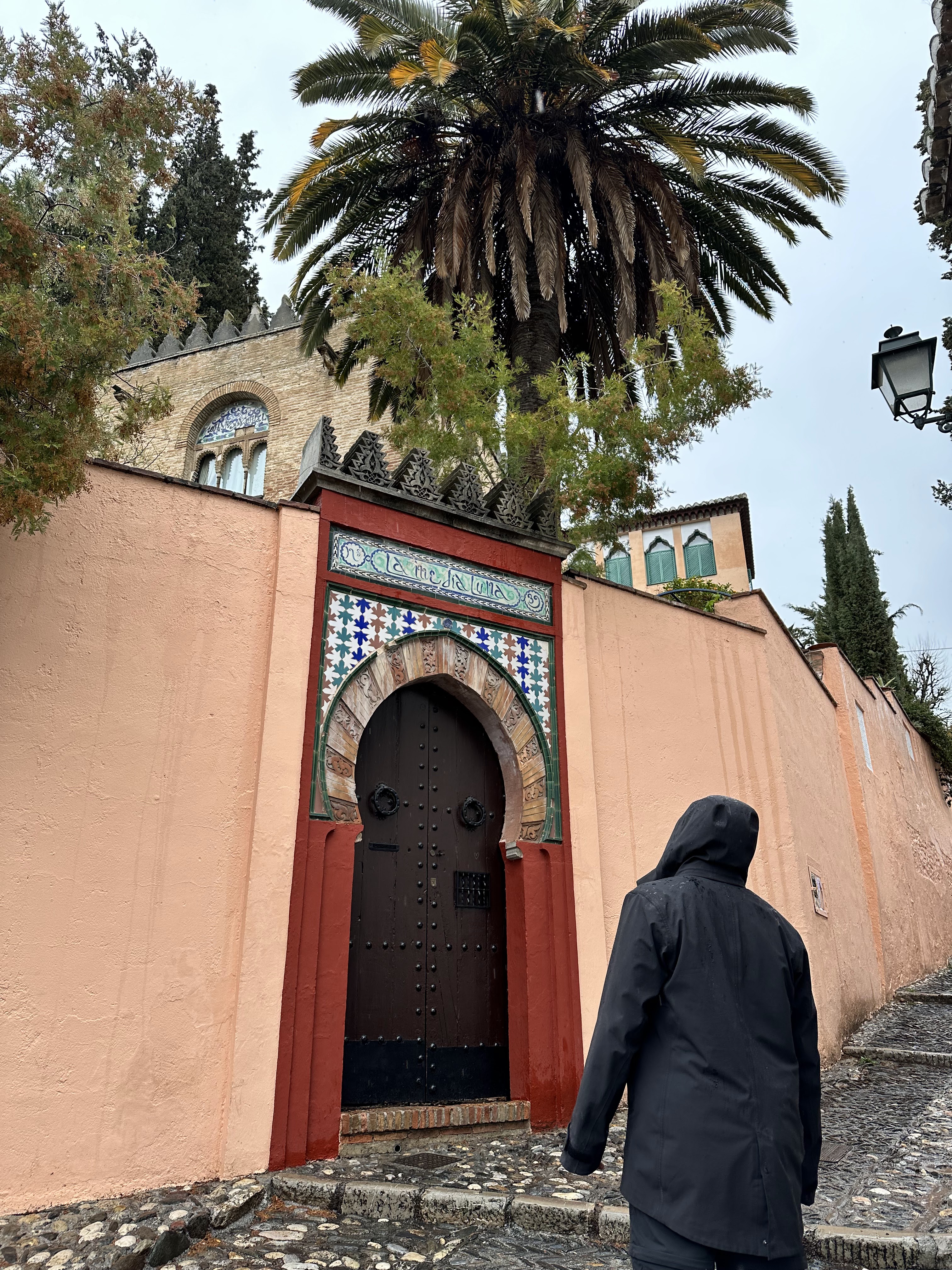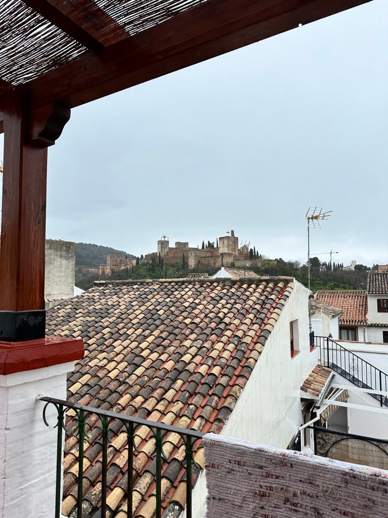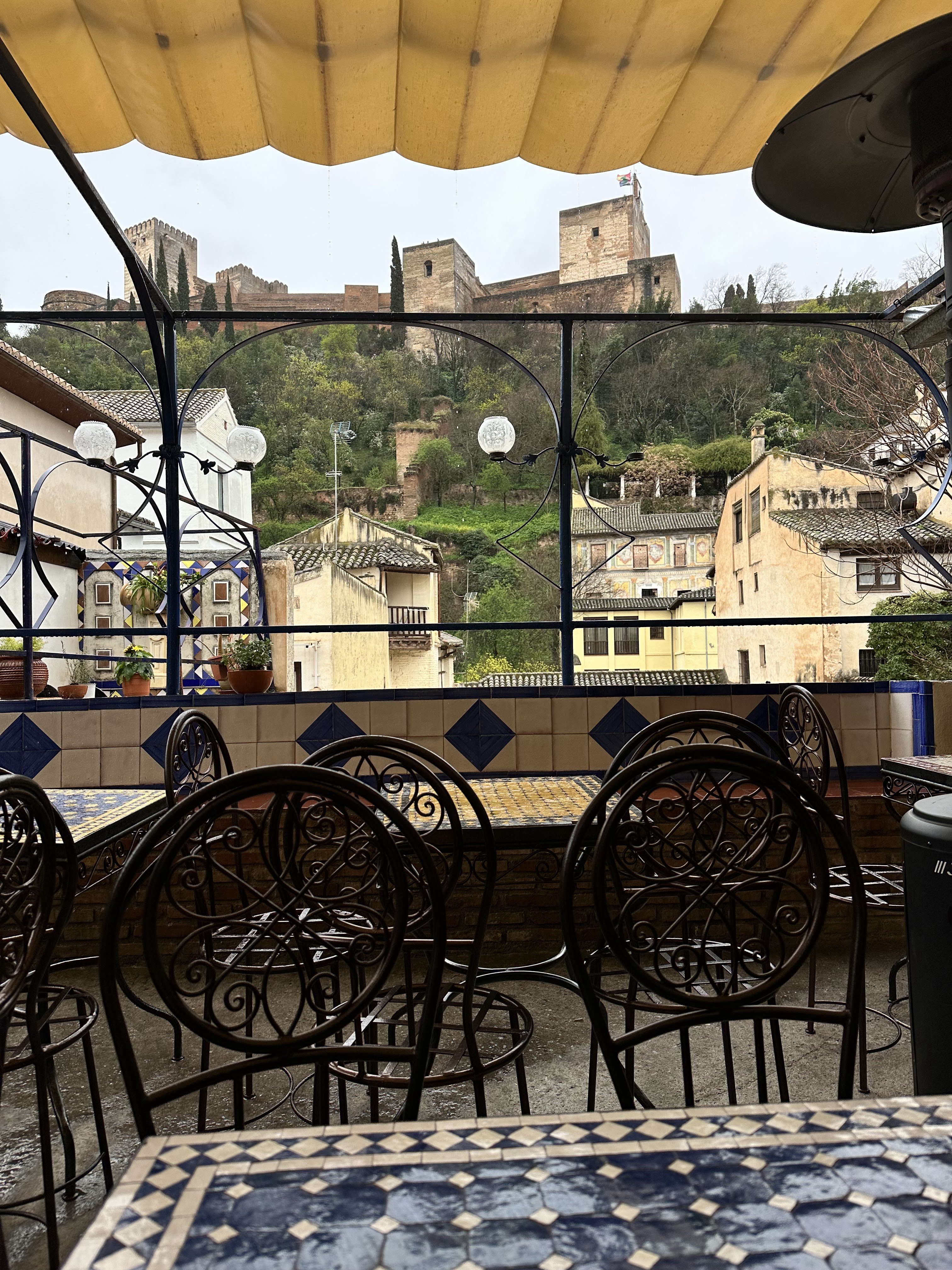 The private rooms were located in a building adjacent to the main part of the hostel, and our room was on the 3rd floor, depending on where you started counting. This part of the hostel was equally as endearing as the rest, with handcrafted wooden panels encasing the staircase, ornate tiles on the floors and walls, and incredibly charming and colorful lamps. After showing us our room, the hostel worker took us up to the top of the building where the terrace was located. Despite the incessant rain, we were still able to enjoy a magnificent view of the Alhambra.