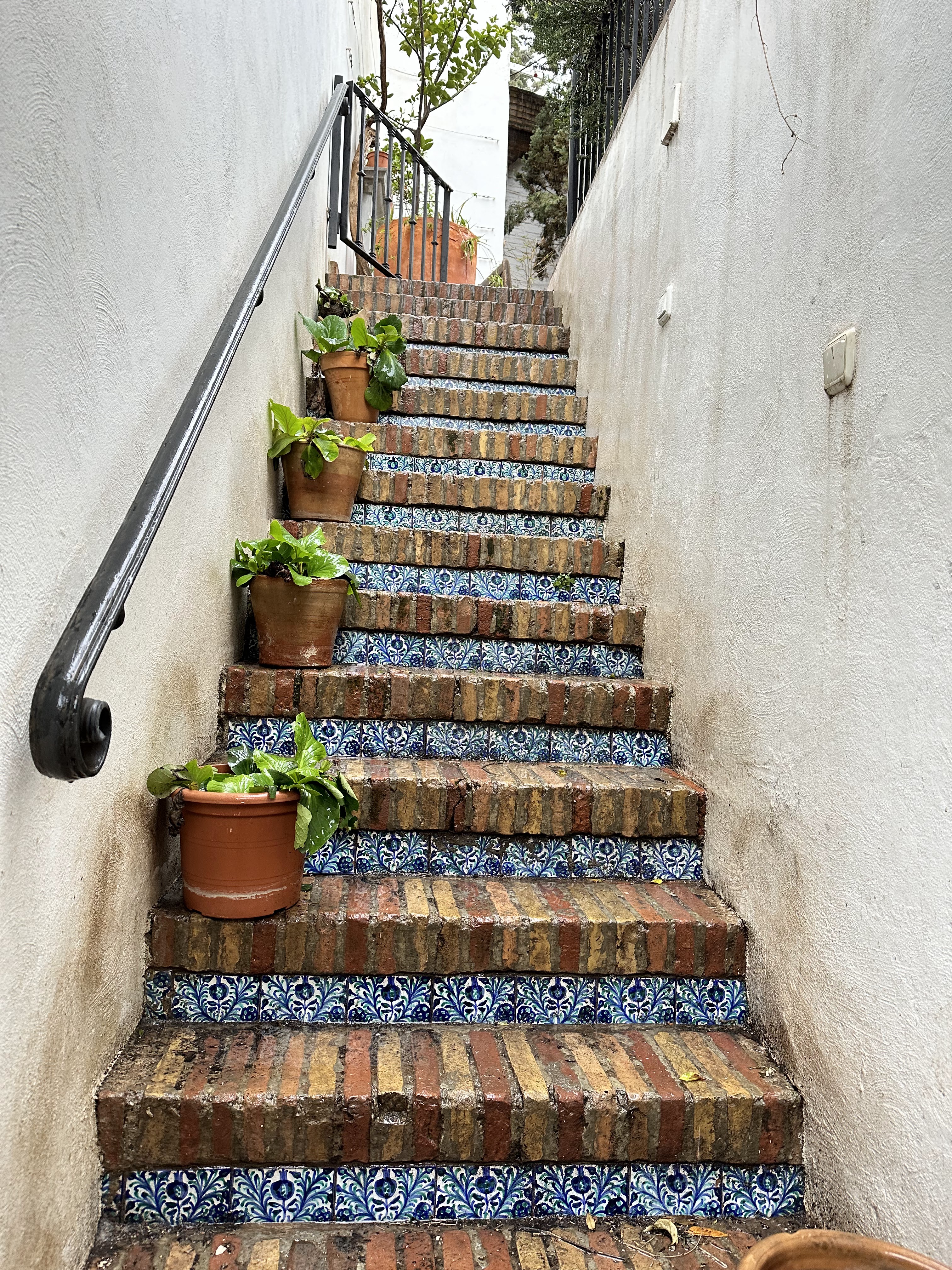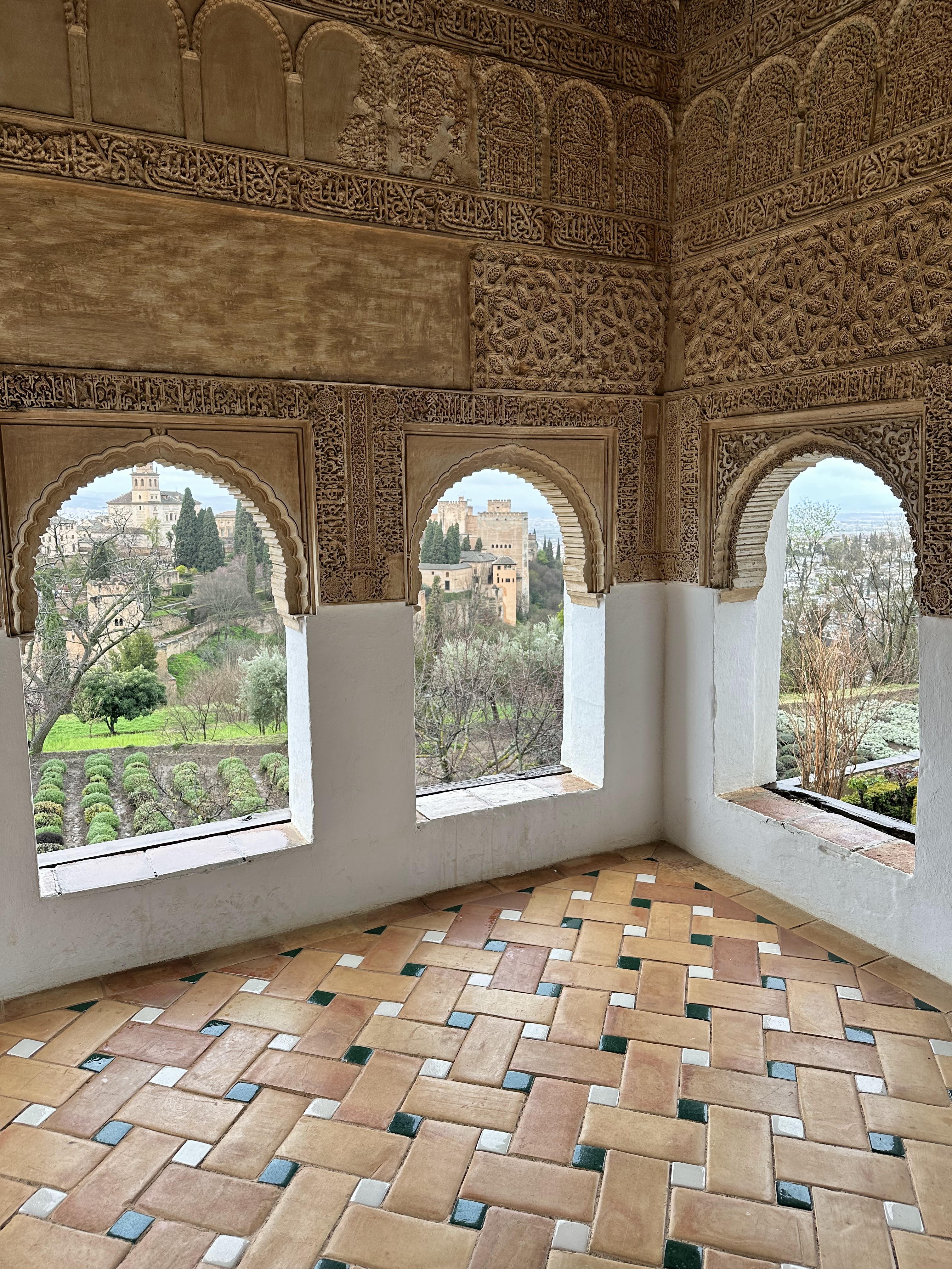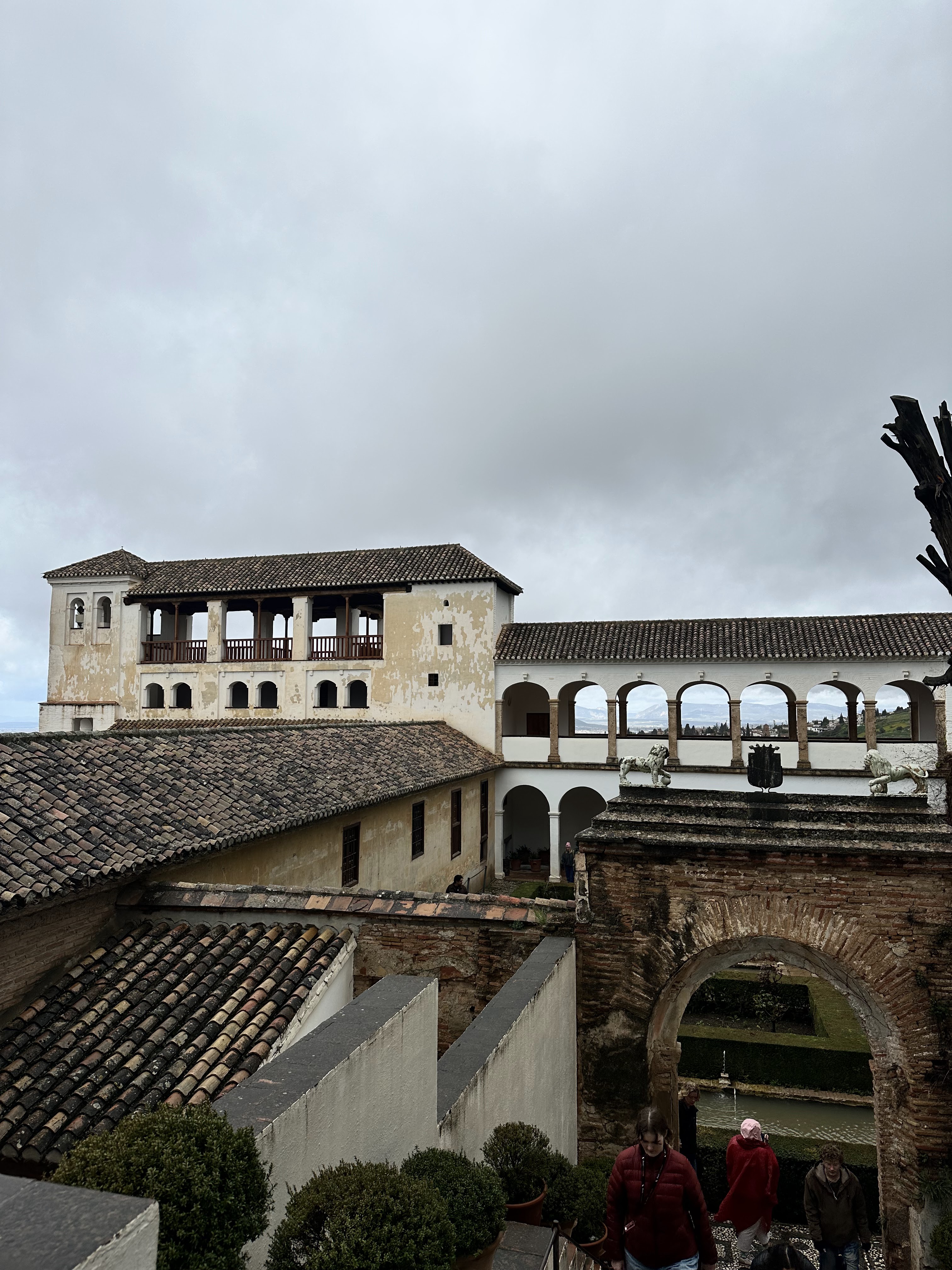The private rooms were located in a building adjacent to the main part of the hostel, and our room was on the 3rd floor, depending on where you started counting. This part of the hostel was equally as endearing as the rest, with handcrafted wooden panels encasing the staircase, ornate tiles on the floors and walls, and incredibly charming and colorful lamps. After showing us our room, the hostel worker took us up to the top of the building where the terrace was located. Despite the incessant rain, we were still able to enjoy a magnificent view of the Alhambra.