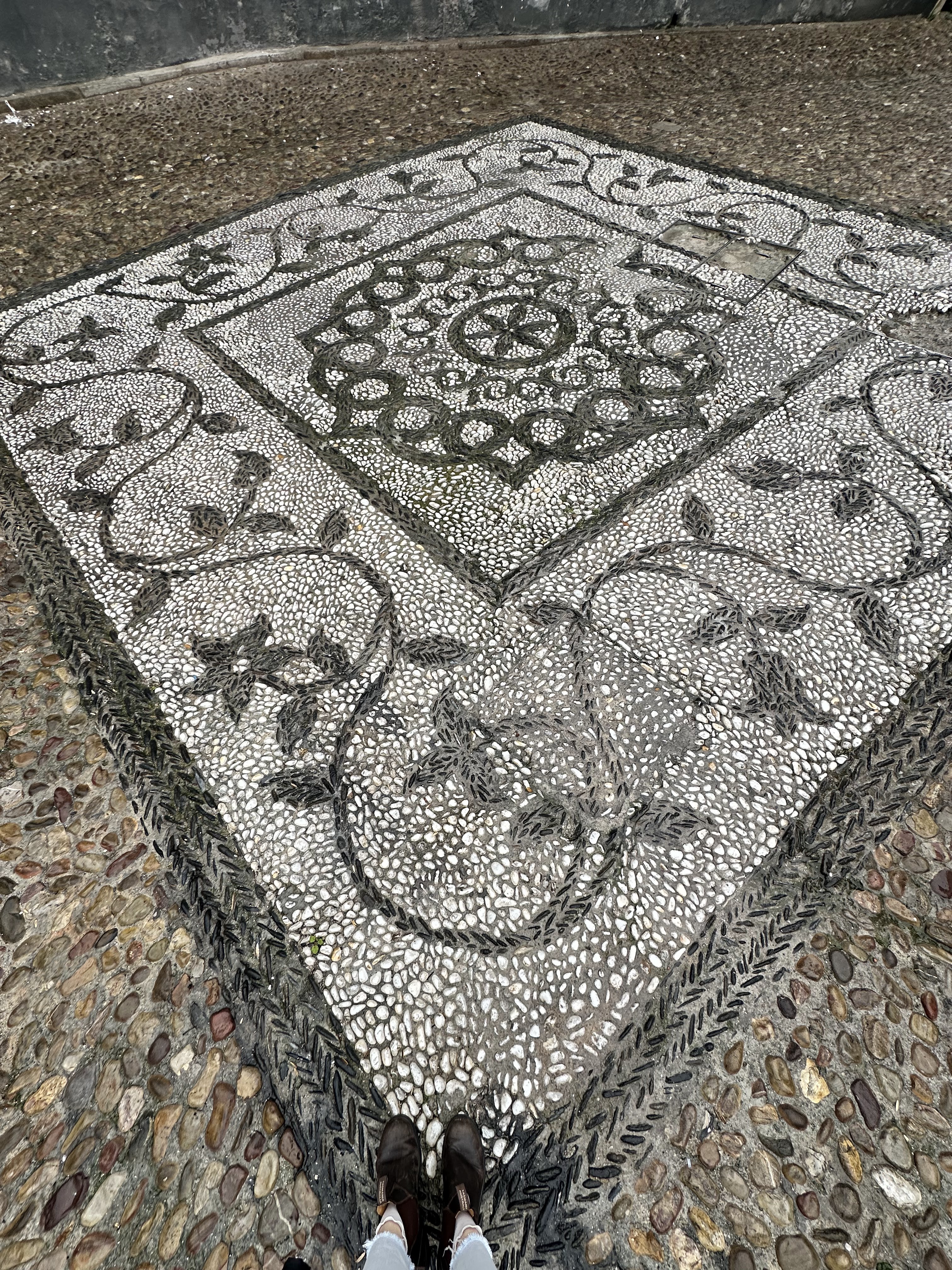 After being greeted by the rain upon our arrival, we traversed our way through the narrow city streets to the hostel to check in and drop off our bags. Immediately, I was stunned by all of the cobblestone streets. There are few cities, including Charleston, that feature historic streets like this – but in Granda, all of the stones are black and white and are crafted into magnificent patterns. I was astonished. I still can’t imagine the amount of labor and time that went into creating such beautiful roadways.