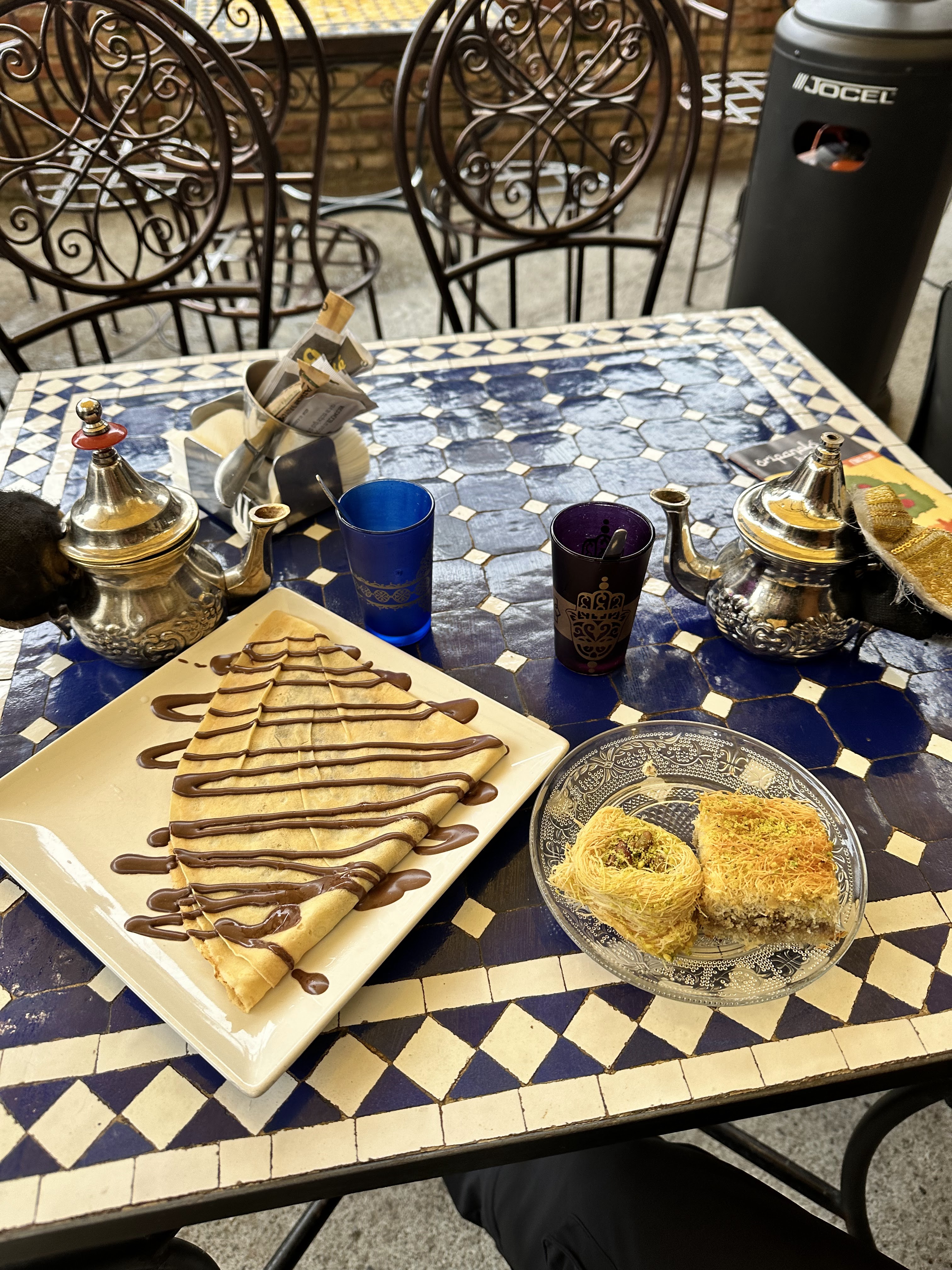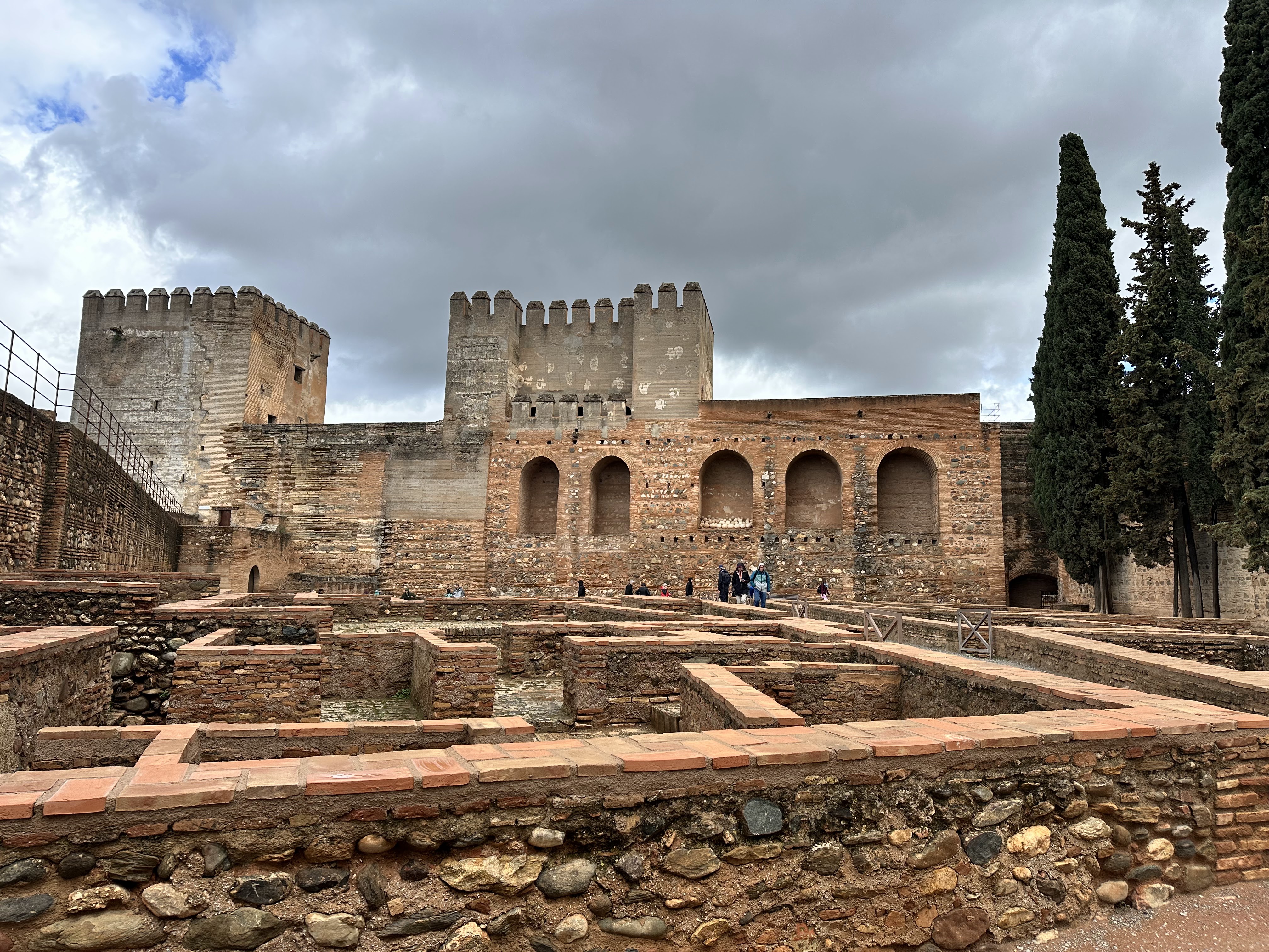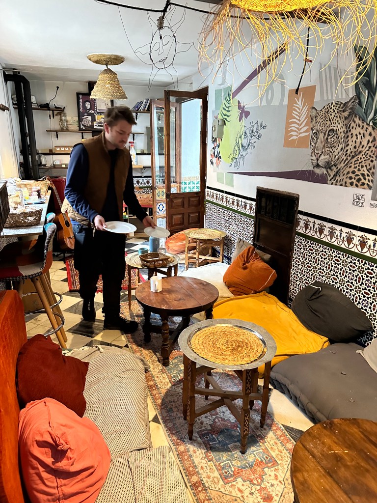 Following the Generalife, we visited La Alcazaba, which formerly housed the Royal guard. Here there were multiple towers from which you could see the entirety of the city. We even spotted the tea shop we dined at the previous day. Unfortunately, because of our tickets, we were unable to visit the Nasrid Palaces, which feature some of the best parts of the fortress. The tour took about 3-4 hours even without the palaces, and by the end I was damp and quite chilly as I had underestimated the temperature when packing. We were in desperate need of food and a warm place to sit. We exited the Alhambra and found a nice place to grab a small bite to eat. We wanted to keep it relatively light since Christian had made us reservations at a Moroccan restaurant that evening at 8:30.
