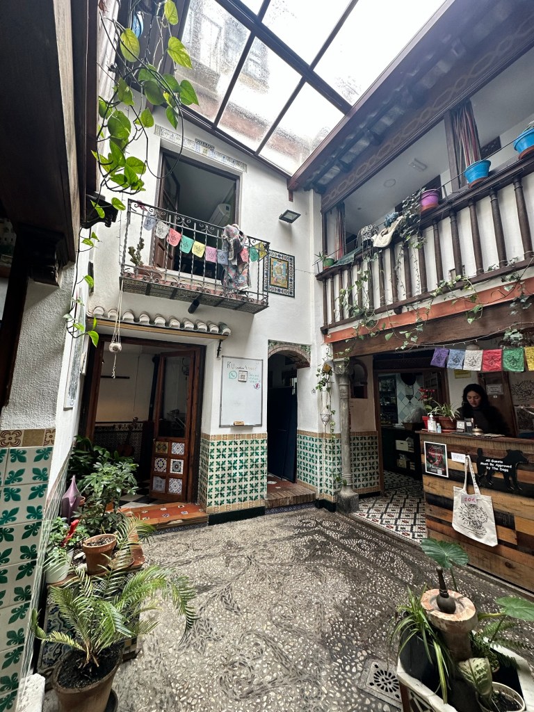 The hostel was nestled off one of the side streets, one narrow enough that you would have to stand to the side and press yourself into the building if a motorcycle passed by (this happened while we were arriving). We entered and I was taken aback by how warm and welcoming it felt. The majority of the light came from the large skylight in the center of the lobby area, with a cozy kitchen and living room off to the side. Much like our other experience in Gran Canaria, the worker who checked us in was as warm and welcoming as the hostel itself.