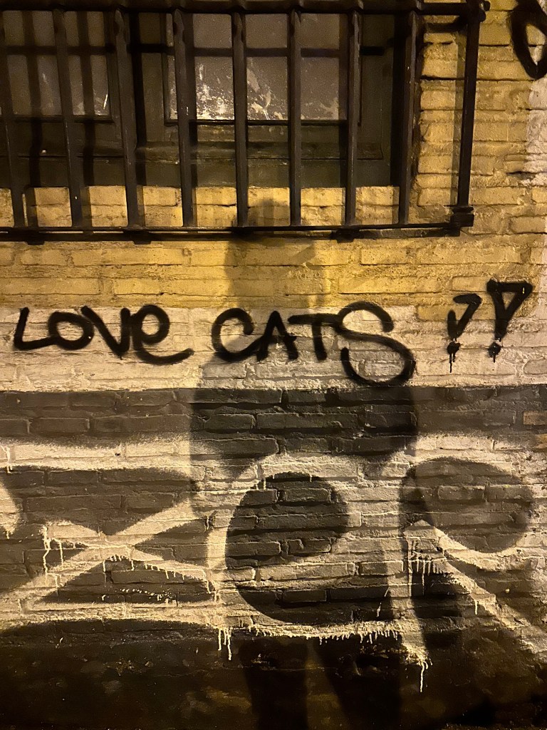 We quickly ditched our bags, and finished our sandwiches we had made that morning before leaving, and left the hostel to see the city. Our tickets to visit the Alhambra were for Sunday, so we had the rest of the afternoon and evening to enjoy the city on our own time. We started our afternoon with tea, crepes, and pastries after walking for about 20 minutes. The tea shop had a lovely patio where we were able to find shelter from the rain. The patio also had a wonderful, even closer than our hostel, view of the Alhambra. It was certainly the main character of the city. I also, as per usual, made a cat friend. I was particularly honored when it would only allow itself to be pet by me and not the other patrons of the shop. As it began to grow chillier, many of the people decided to head inside. Christian and I were the last ones standing as we embraced the cool air, this was even acknowledged by the server who popped out and said as much.