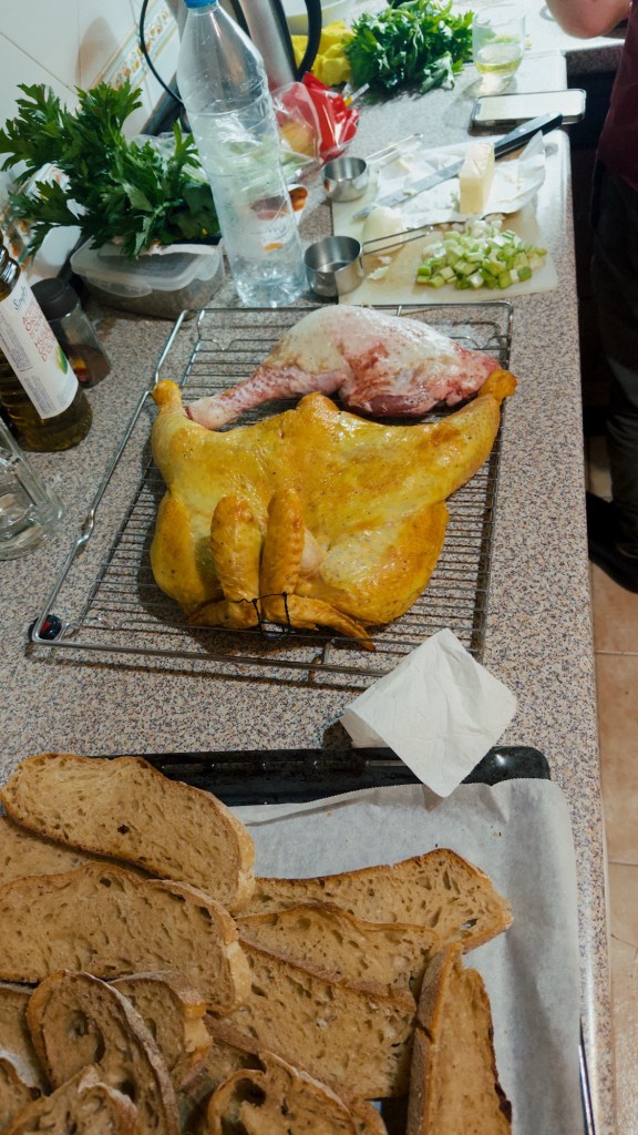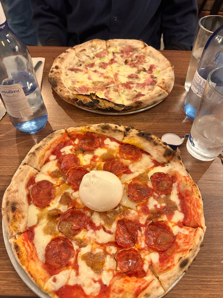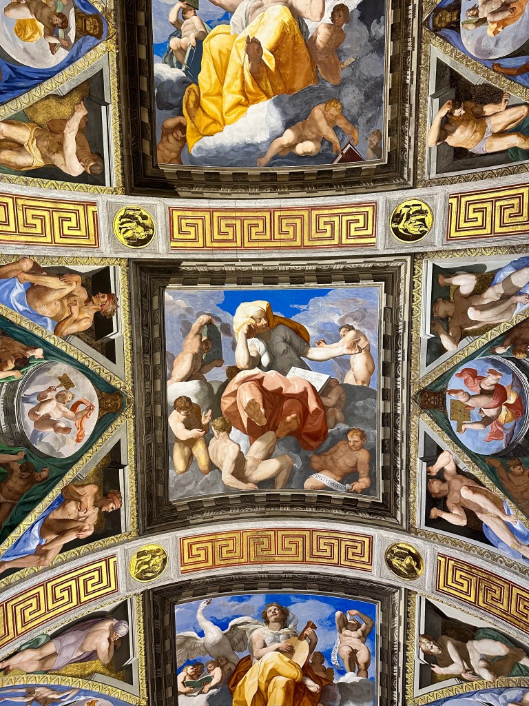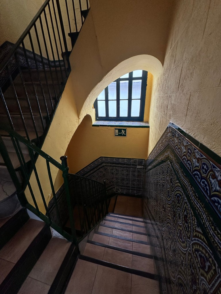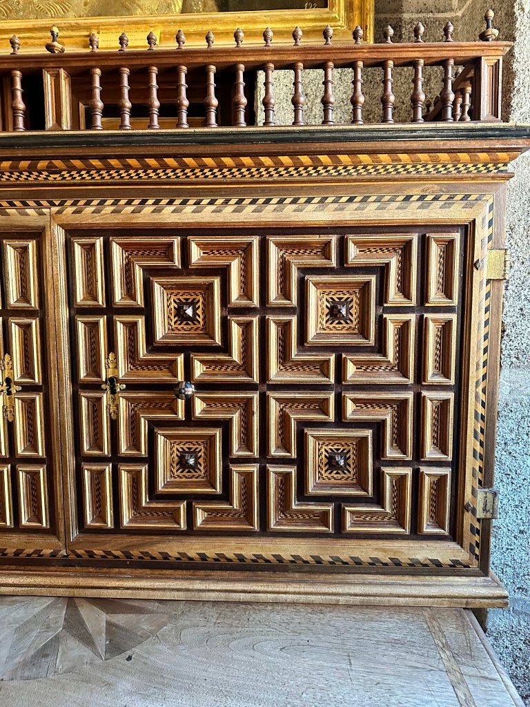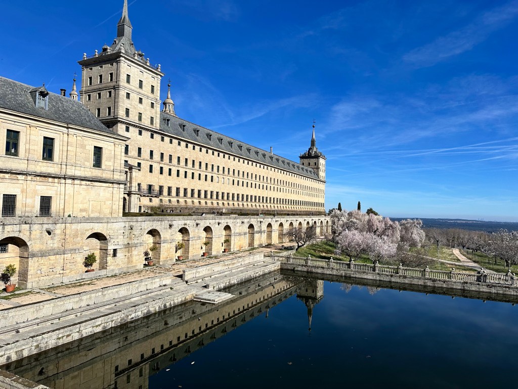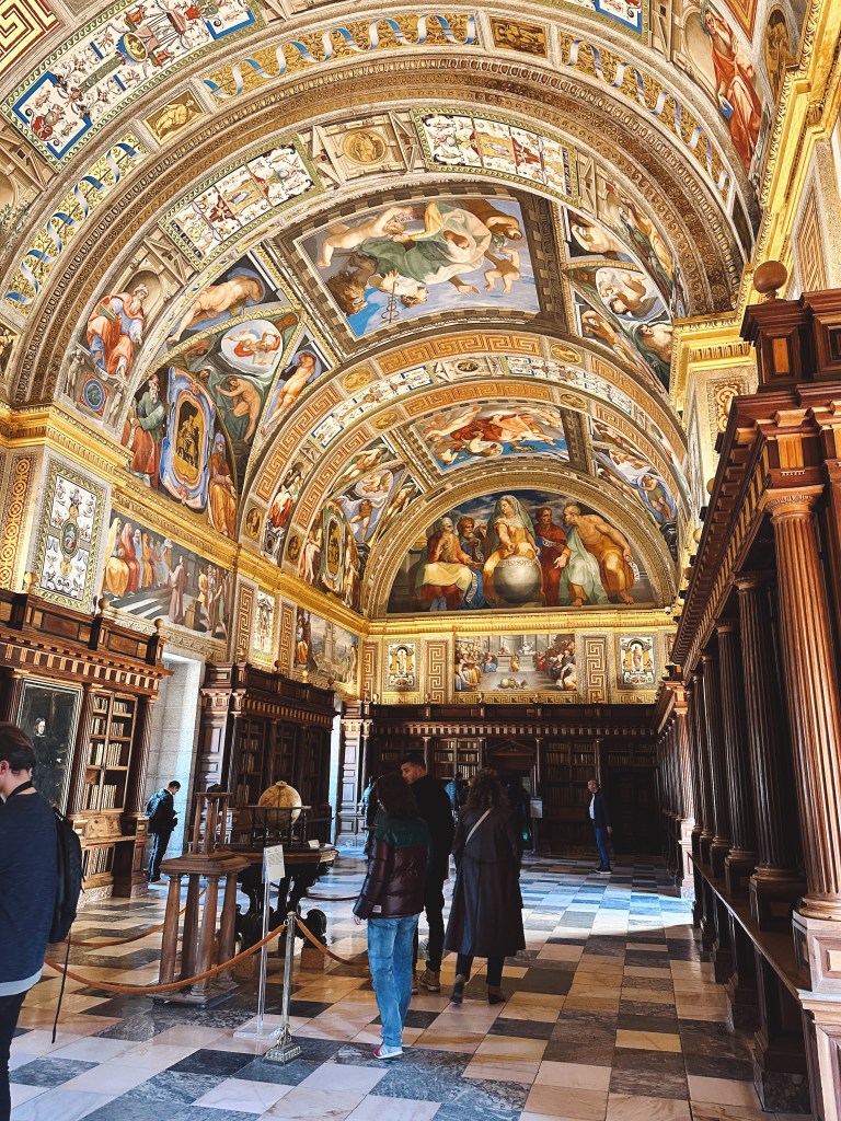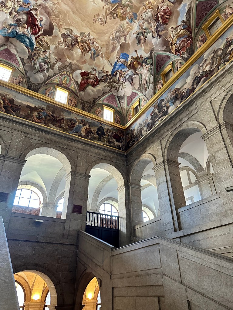 El Escorial – historical residence of the King of Spain. We visited by bus!El Escorial Interior! The colors were even more stunning in personArtwork on every ceilingIntricate woodwork on a desk inside the libraryClose up of the ceilingShadows in the hallwayOur first night out!Trying out pizza each Friday!Salud!What makes Spain go ’roundIn the kitchen!Celebrating the countries today! 3rd grade is Italy!